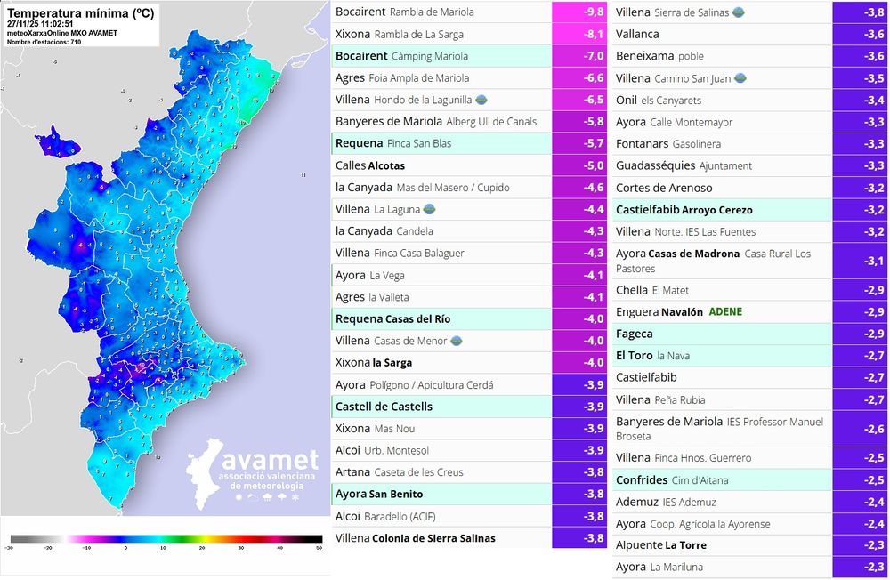El valor més baix (vora -6 ºC) l'ha registrat el Mas de Planet (Morella).