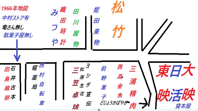 中村ストアは有 竜さんは無 みつやor前野の菓子屋 金魚屋 果物屋 卓球屋 貸本屋 自転車屋 どじょうの蒲焼屋 コロッケの三浦 夏休みの朝 子供だけで入れる映画街 何を見ようか楽しみだった