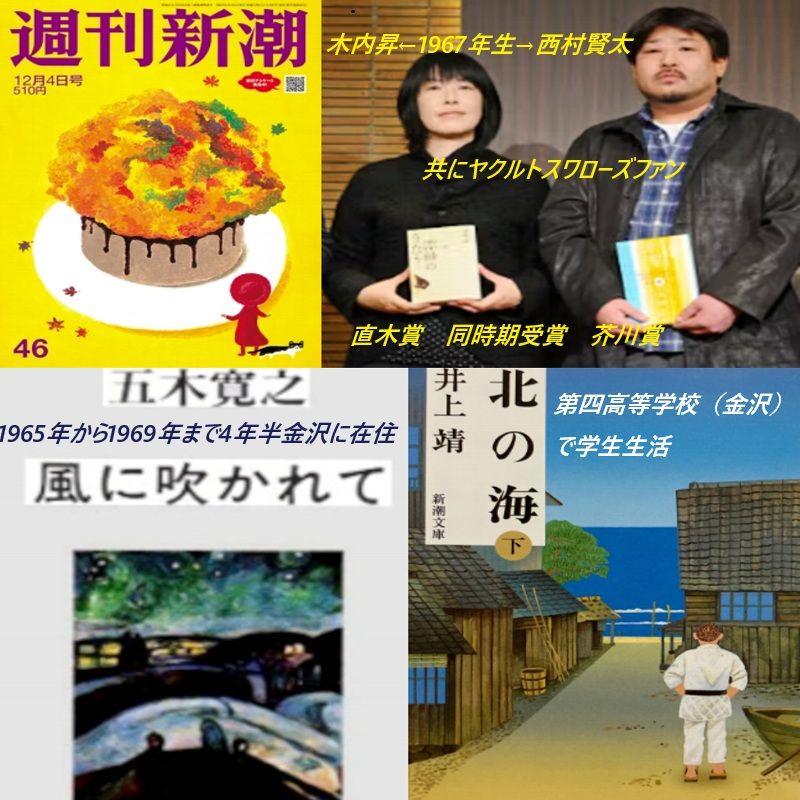 週刊新潮に五木寛之氏が鏡花賞選考委員に依頼した井上靖先生についての思い出話有 井上先生は金沢の四高在学のことを 「北の海」に書いた 昔 井上先生の講演を聞いたが面白かった(作家は皆話が上手い) 木内昇(のぼり)氏は西村賢太氏と同時期に直木賞芥川賞を受賞し共に同い年。一緒にヤクルトの試合も見に行った仲良しだそうだ 西村賢太氏の資料があるかもしれない石川近代文学館の休館を残念がっていました。