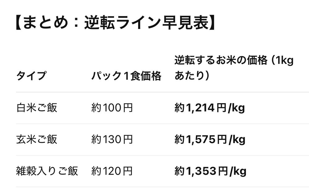 → お米が1kgあたり約1,214円以上だと「パックご飯」と同等か高くなる