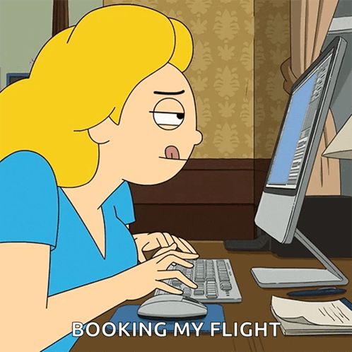 ALT: a cartoon of a woman sitting at a desk typing on a keyboard with the caption booking my flight
