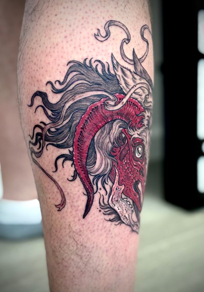 Dog & Dragon based on the short story by Brandon Sanderson, tattooed for my client Laker 🖤 the dog in the tattoo is based on his pup who passed away