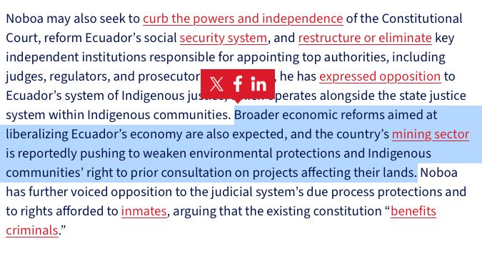 Essential update on legal, political and economic developments in Ecuador since September — from @cepr.org. Here is a section linking Noboa's constitutional reform hopes to investor-state dispute settlement and the Canada FTA. Cdn mining firms back the proposal.