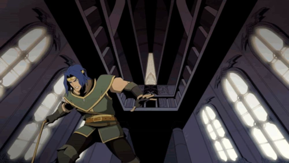 ALT: a man with blue hair is holding a sword in a dark room with lots of windows