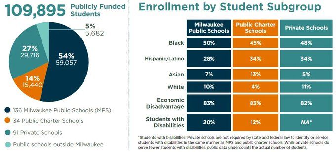 Citywide, enrollment declines continue, and across most demographics MKE's schools continue to converge. Even for special education, we're seeing larger numbers in both public charter and private schools (though data challenges make it hard to compare)