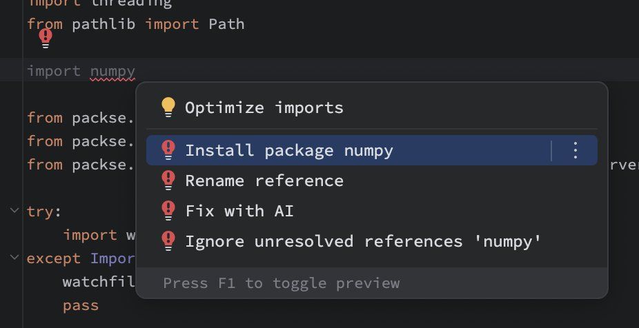 Once selected, Quick Fix actions will allow you to install missing packages into your environment with uv.
