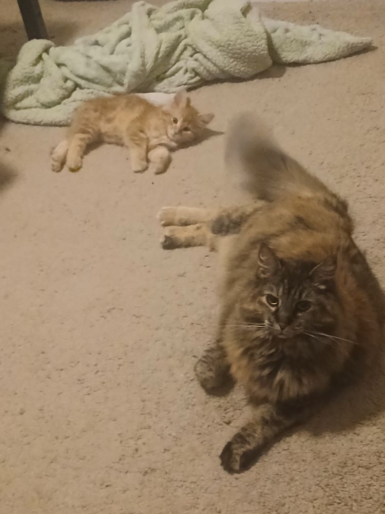He's adjusting well to his new home, big sis Pepper doesn't like him rn but she's so curious about him 💕 she's just a little angies but you can tell she'll warm up hehe