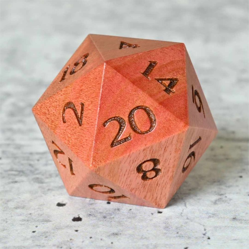 Hey, it's been a while! Here's a York Gum burl wood d20 I made as a test, knowing it might just end up in my personal "unsellable" collection. I would normally fill the voids for stability and balance, but I really like the void aesthetic. #dice #dnd #ttrpg #woodworking