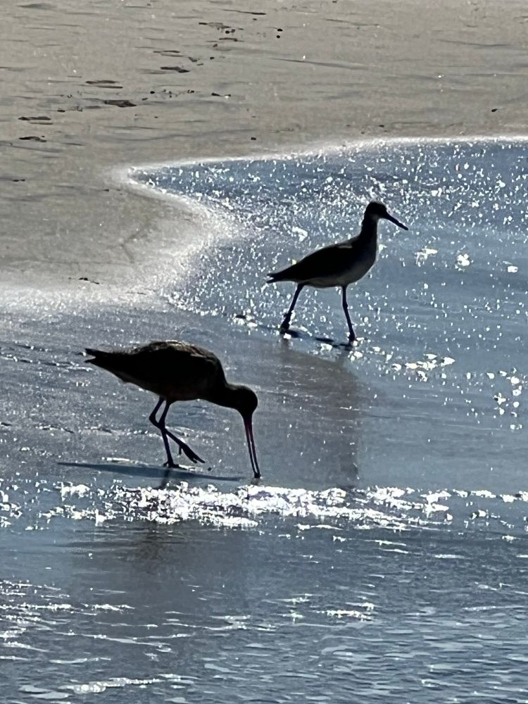 Birds walking the beach.