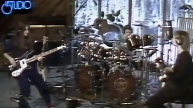 ALT: a man is playing a guitar in front of a drum set with a neon sign that says studio