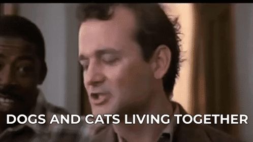 a man is talking to another man and the words `` dogs and cats living together '' are written on the screen .