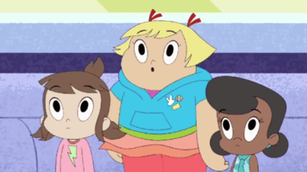 ALT: a cartoon of three girls standing next to each other with one wearing a blue shirt with a bird on it
