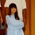 ALT: a woman in a blue dress is standing with her arms crossed in front of a man in a white shirt .