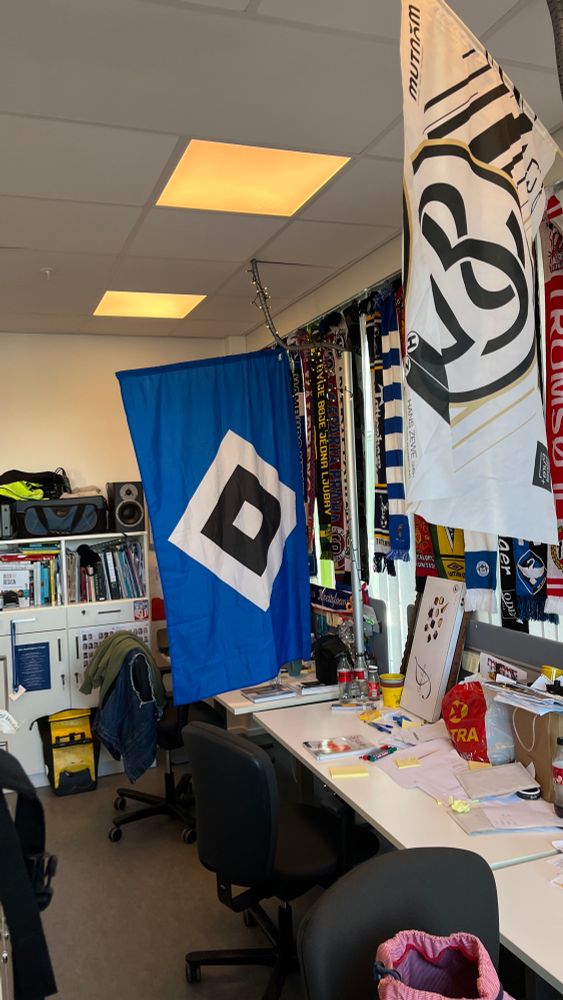 @dhzpod.bsky.social Kan melde at Hamburgersupporteren på kontoret har gått i til anskaffelse av nytt flagg på kontoret! Dog et litt spinkelt format i forhold til det noget større (og mer grandiose) Die Elv-flagg lengre nede på pultrekka.