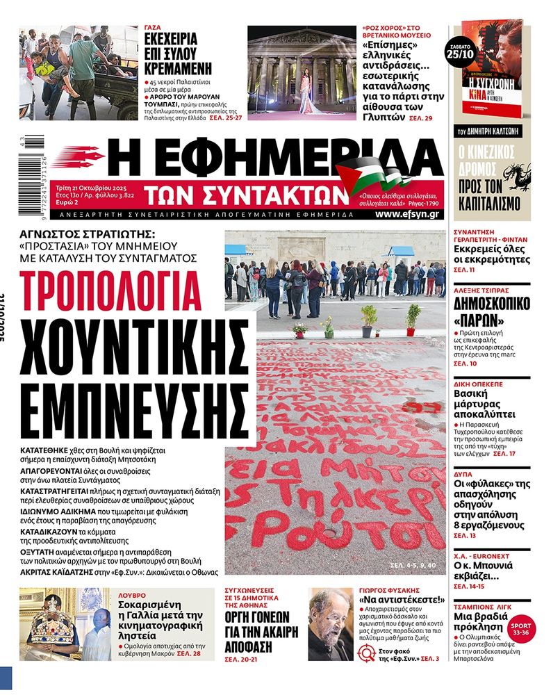 Το σημερινό πρωτοσέλιδο της Εφημερίδας των Συντακτών.
