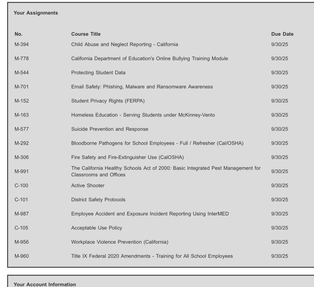 Look at all these trainings. I’ve done all of these multiple times. If I wait till school starts, I have a month & a 1/2. Keep in mind, I’ll be teaching at that point. Or I can start now, which means giving up my vacation time. They need to stop making us do the same trainings over and over. So dumb