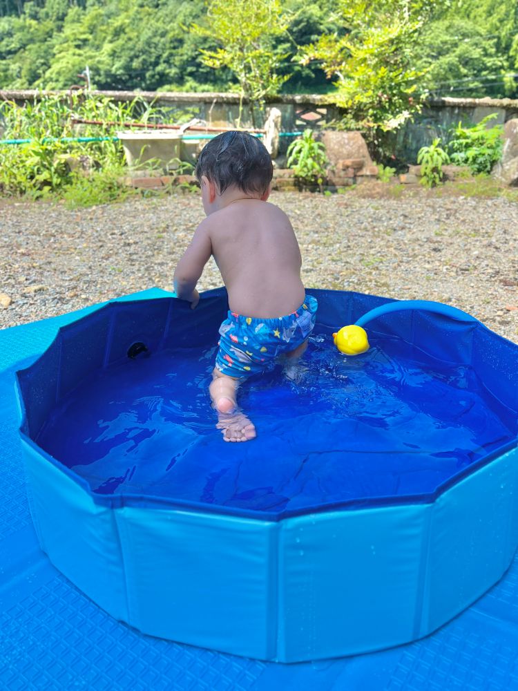 今朝は買っておいたプールで水遊びをした!母がパラソルを準備してくれてありがたかった。小さいかなと思ったけどけっこう大きかったです。