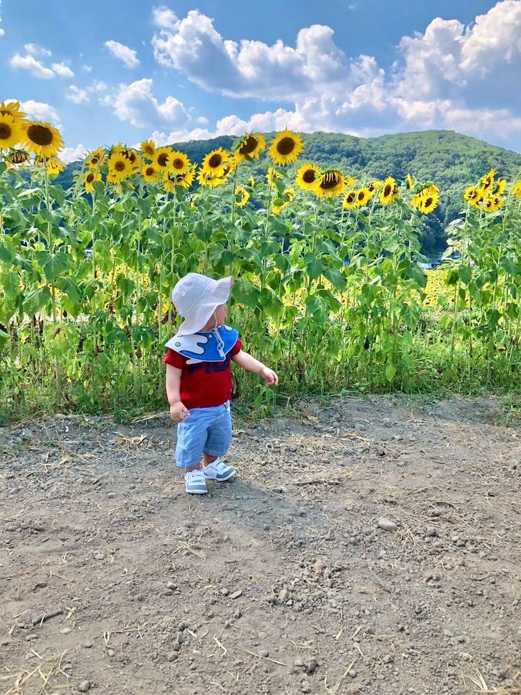 今日はわたしと息子で実家に帰省!ちいおばあちゃんの施設に会いに行って、ひまわり畑に連れて行ってもらいました。暑かったけど綺麗だった!