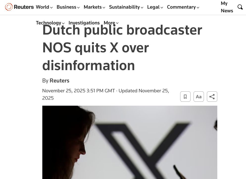 "Dutch state-funded public broadcaster NOS said it stopped posting on Elon Musk's social media platform #X, as it said it didn't want to facilitate the spread of disinformation.