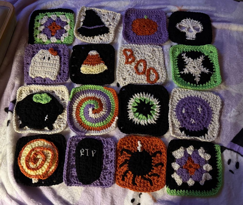 Made 10/24 of the squares for this Halloween sweater 🎃💀🌙