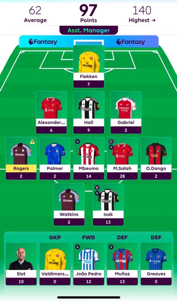 Bench boost week where I somehow managed to avoid Saka and KDB and new recruits Mbeumo, Kiwior and Rashford all did the business.