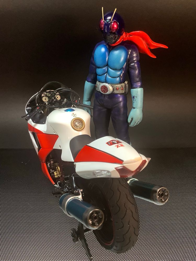 今日の模型。ジロー模型レジンキット(ファンアート)館長さん原型の仮面ライダー1号。基本塗装終了。やはり、このライダーだとマッシブでカッコイイのですが、RC166改だと非力に感じる。ZX改クラスの大型バイクに合う感じですね(^^)元々、サンダーに合わせた車体だからなぁ。館長さんの事だから、またコレに合うライダーを作るでしょう!(当たり前の様にリクエストするのがジロー模型)