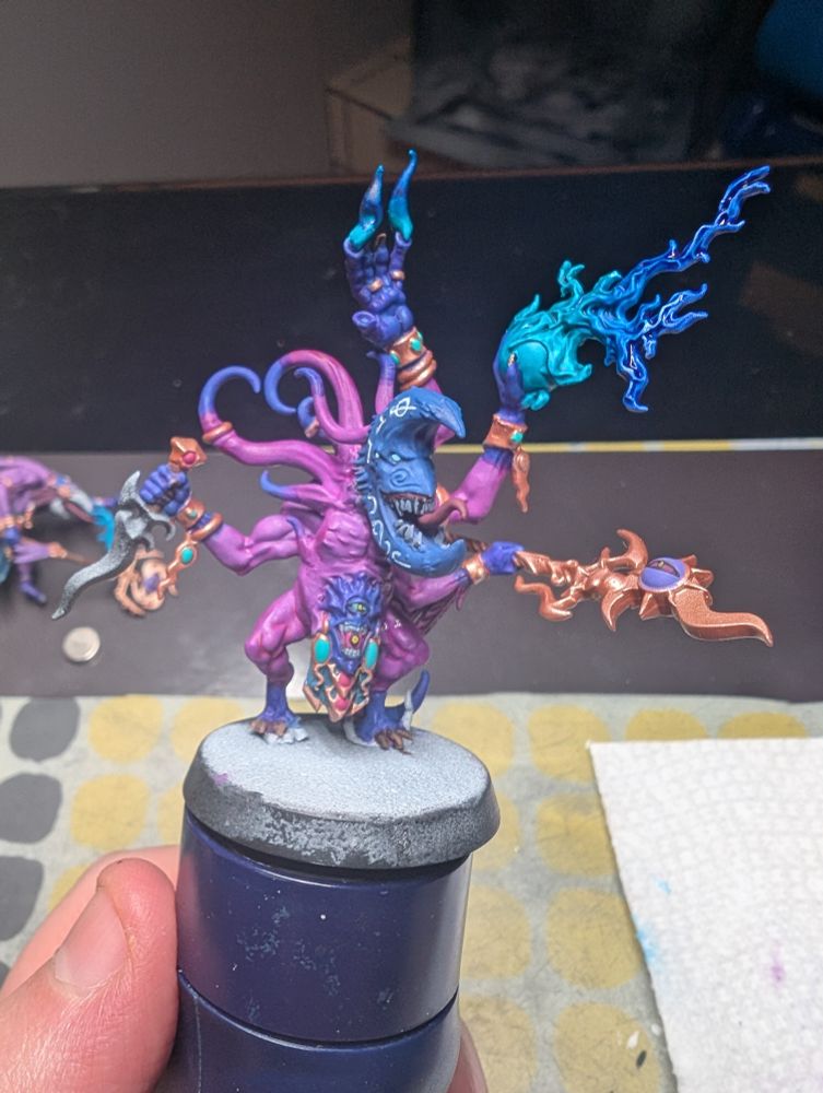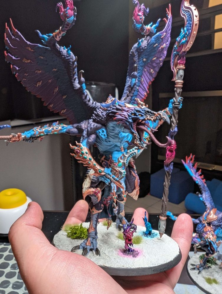 WIP shot of the Lord of change warlord purple for the eye then turquoise+ dark turquoise ink for embedded gems, then ultramarine + turquoise for claws then warlord purple + squid pink into hexed lichen+ warlord purple into hexed lichen + imperial blue then washed with a violet into magenta ink