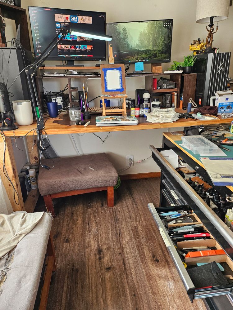 Have a 10ft table i made with 1 1/2 door blanks and 4 4x4s for the husband and I. I also have a Husky tool cabinet for my art paraphernalia. Made some stands for my monitors so I have maximum desk space and a leather sheet down as a desk mat