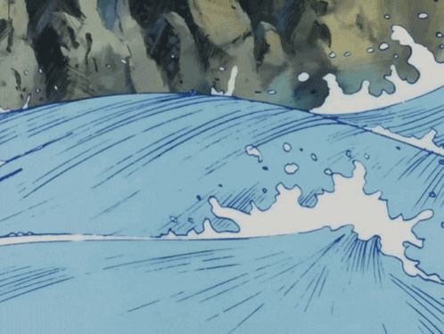 ALT: a drawing of a wave crashing against a rocky cliff