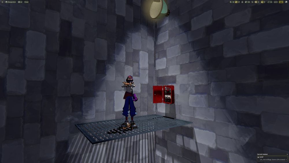 - A lot of games go with the "render the silhouette of the character on top of any occluding geometry" approach, but we went with a shader cutout effect, like so: