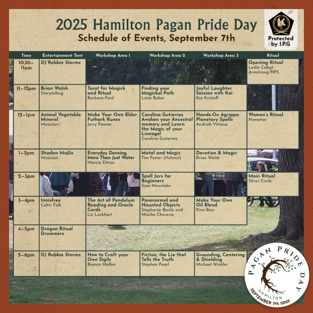 Our schedule for Hamilton Pagan Pride Day 2025, come see us on Sunday September 7th. There will be plenty of entertainment, presenters, programming and rituals for everyone to enjoy, all for free! #paganpride #pagan #wicca #druid #heathen #hamiltonontario #hamiltonontariocanada #Hamilton #paganism