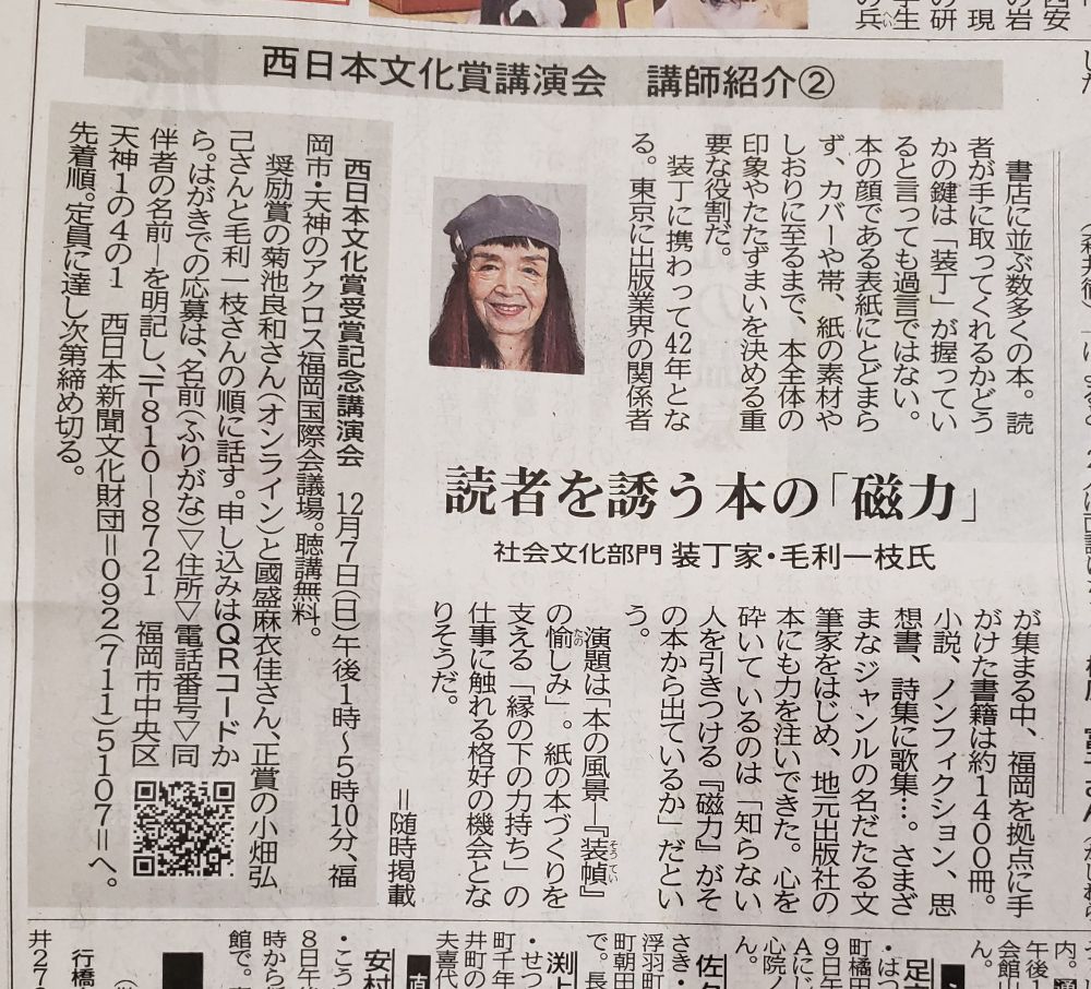 2025年11月8日の西日本新聞に博多時代の飲み仲間、毛利一枝さんが出ていた。