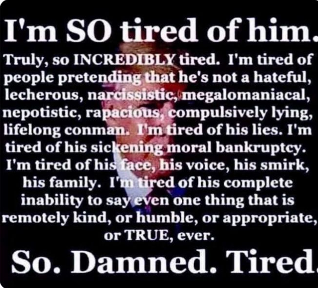 Extremely tired...and sooo tired of his cult members thinking he is flawless...that he's going to make us all rich...so very tired of it all...