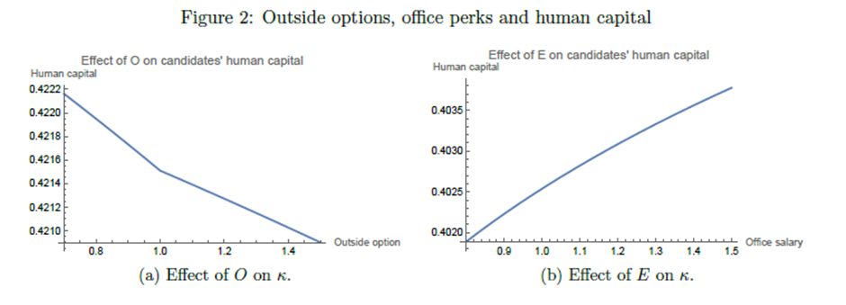 • Conditional on holding office, lowering the value of PCOs raises the cost of losing—similar to a wage increase while in office → more incentive to avoid unpopular policies.