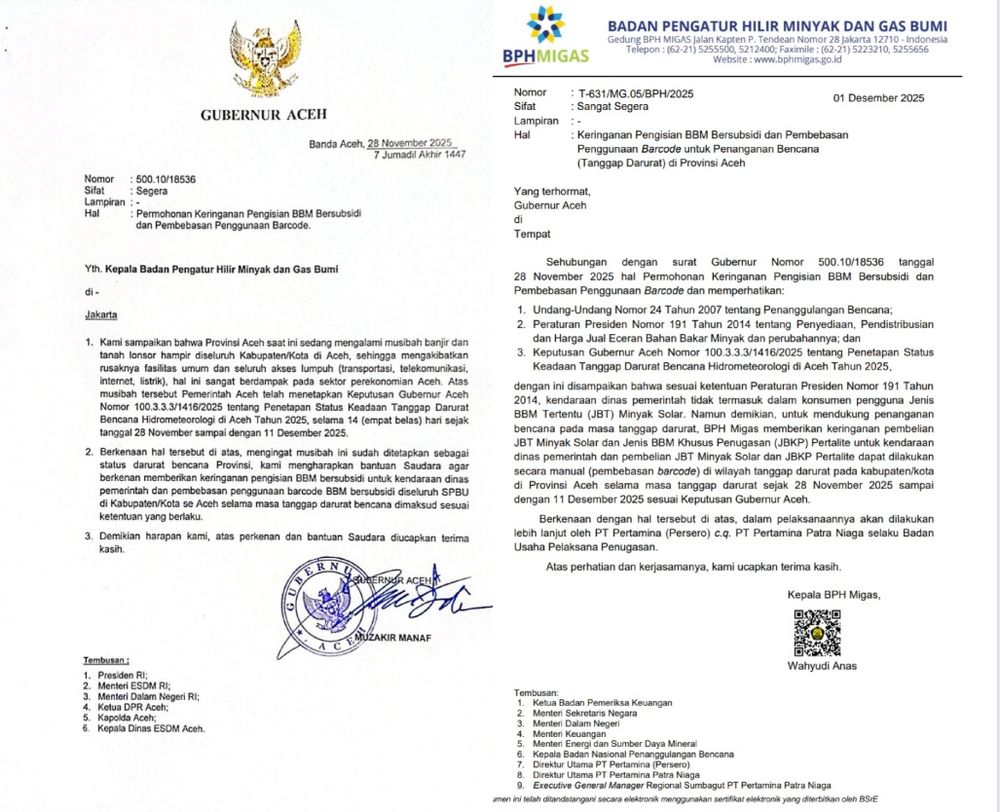 Banda Aceh, Infoaceh.net – Langkah cepat Gubernur Aceh Muzakkir Manaf (Mualem) akhirnya membuahkan hasil. Badan Pengatur Hilir Minyak dan Gas Bumi (BPH Migas) resmi menyetujui permintaan pembebasan penggunaan…