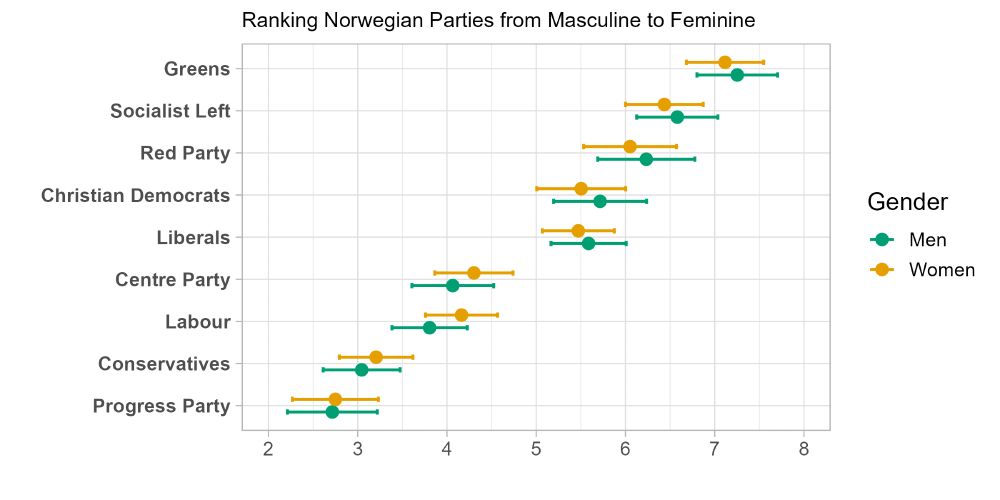 Want to see something cool? We live in a gendered world where certain things and activities are seen as more feminine or masculine. But we don’t often consider that political parties can also be gender-coded. I asked ~1,300 students to rank the Norwegian parties from most masculine to most feminine.