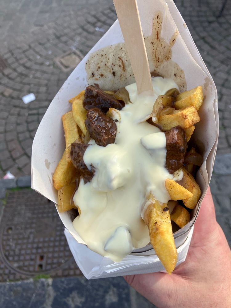 I heard this app is popular for posting pictures of food you recently had, so here’s a pack of fries in Maastricht, Netherlands topped with with zuurvlees and mayonnaise.