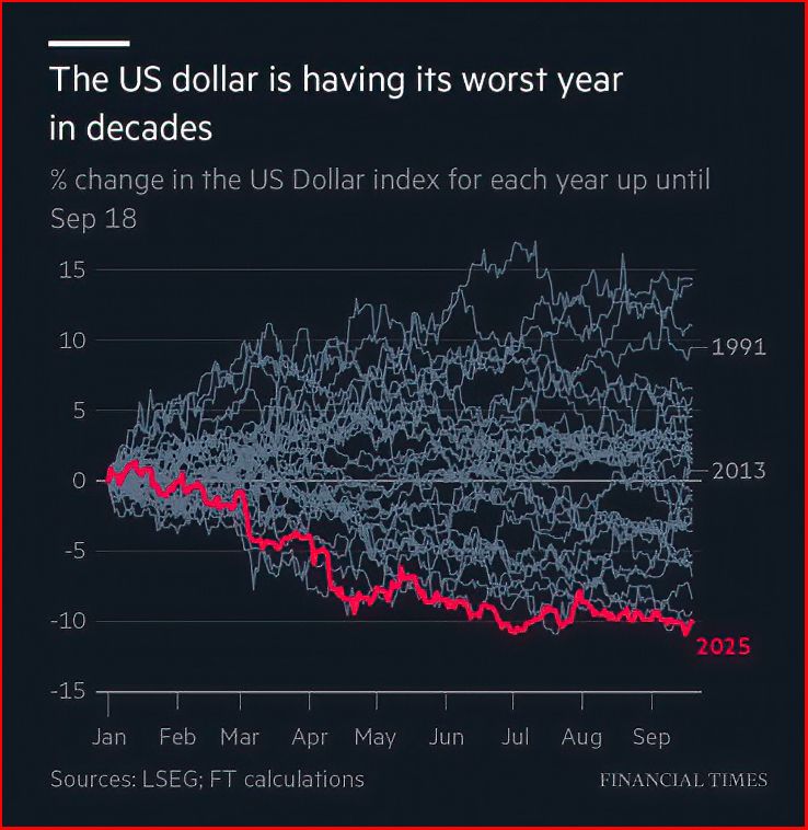 Financial Times reports the US Dollar is having its worst year in decades and has lost significant value.