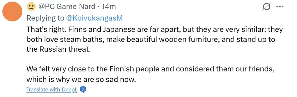 "jo nyt lukuisat, aiemmin Suomesta pitäneet japanilaiset ilmoittavat julkisesti, etteivät enää halua olla maan kanssa tekemisissä tai tukea sitä esimerkiksi aiemmin rakastamiaan suomalaisia tuotteita ostamalla."