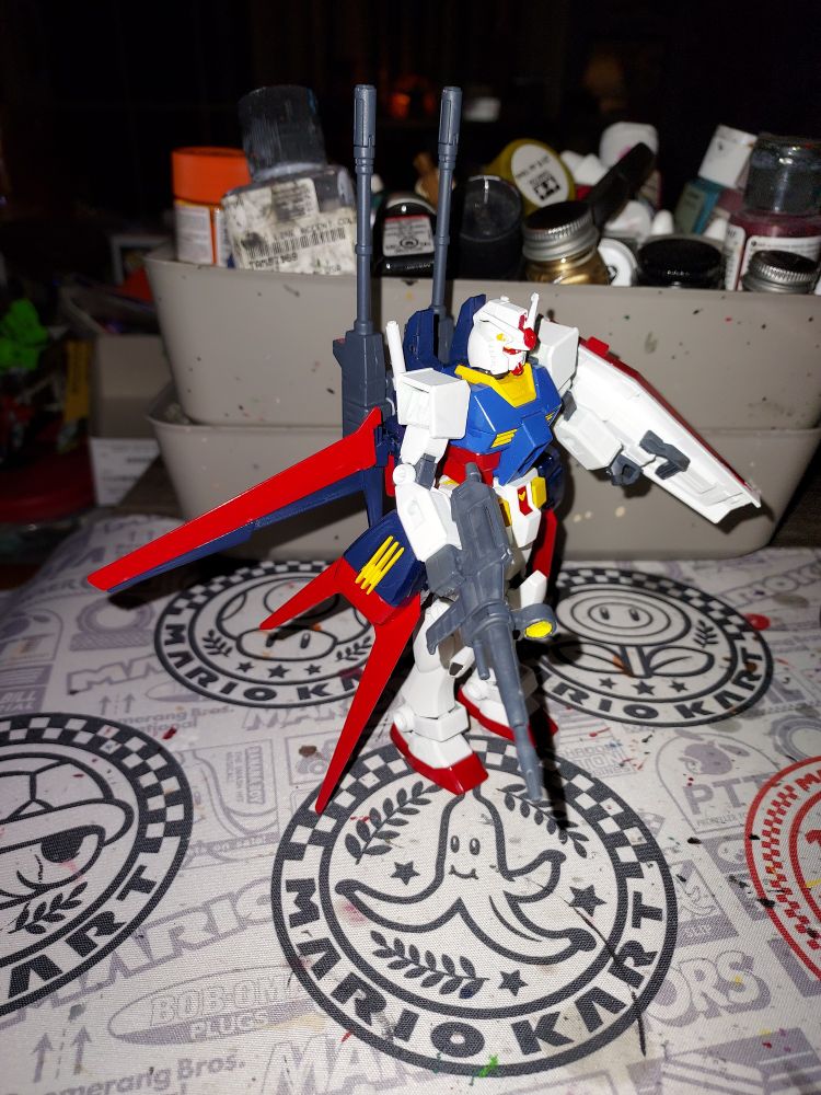 Put together a combo Gramps Gundam and G-Fighter idea. Used the EG RX-78-2 and Aile Strike pack, an HGUC Ball turret, and some Leo and gunpla build bits to connect it all.