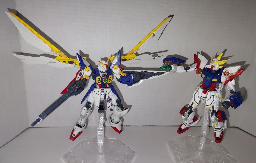 Here's the RG Shining Gundam, I had been waiting for it for a while. The kit's legs are the most intricate parts with the expansion gimmick and gimbled jets. I had some spare King of Hearts decals so I had to use them. And it's fighting the RG Wing since why not.