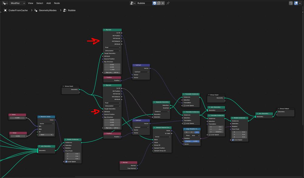 Geo-nodes continue to be my fav thing to play with. Using 'em to match up fractured pieces of the ground with the crater Rog makes atm: