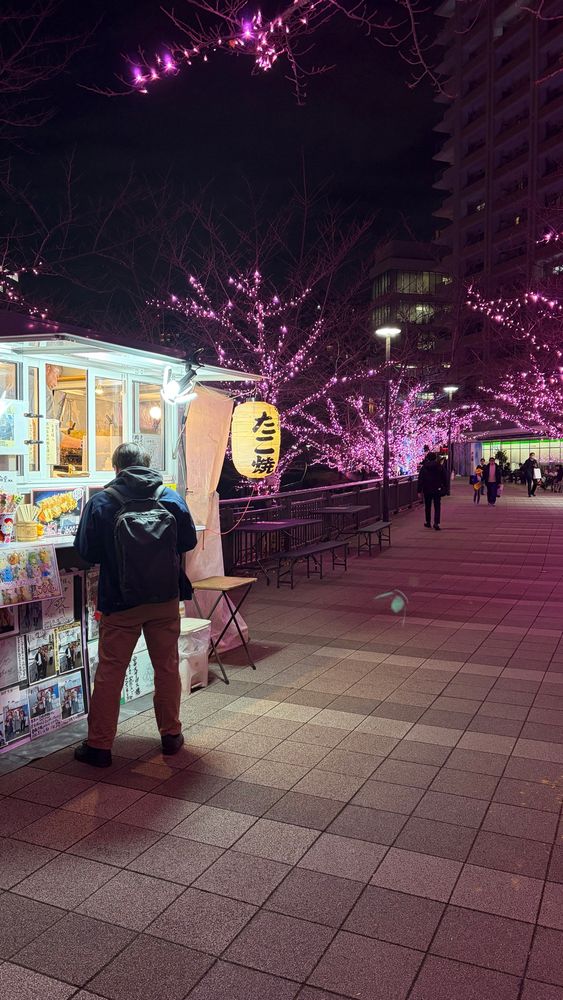 ピンクのイルミネーションに誘われて、缶ビール片手に🐙たこ焼きを…と行きたいところ。今日はボッチだから離脱します🫡