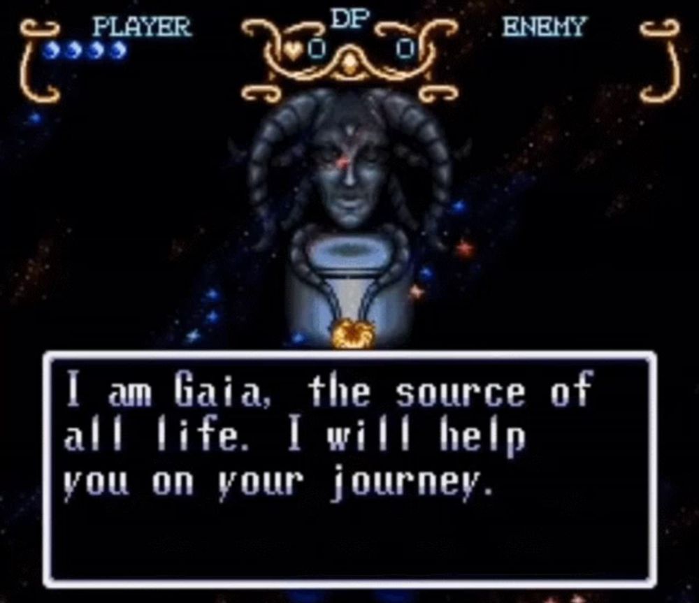 ALT: a screenshot of a video game that says gaia the source of all life