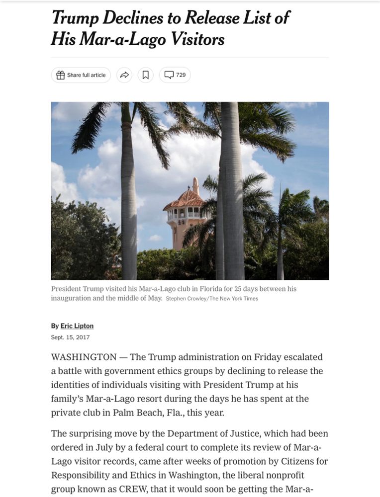 Per NYT, Trump had been ordered by a federal court in July to release the records of presidential visitors at Mar-a-Lago that were subject to the open records law by Sept 2017.