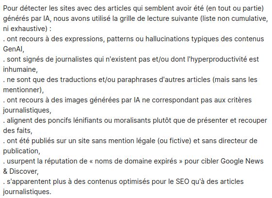 tl;dr : la grille de lecture (liste non cumulative, ni exhaustive) nous ayant permis de détecter les sites d'info contenant des articles qui semblent avoir été (en tout ou partie) générés par IA : /18