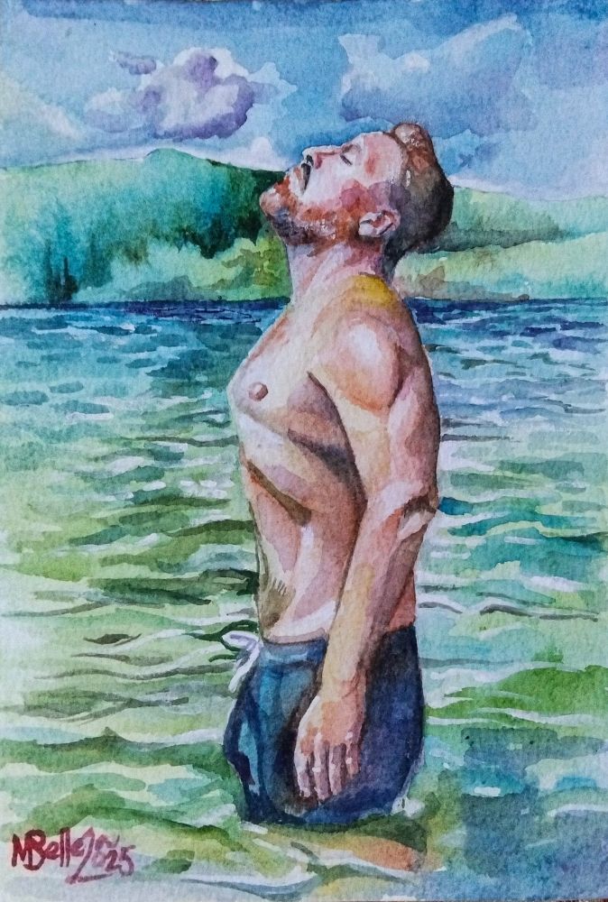 #malemodel #maleshirtless #maletorso #maleanatomy #environment #nature #river #newzealand #aotearoa #clearriver #watercolor #watercoloronpaper #riverwaves