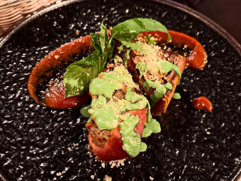Signora eggplant parmigiana with tomato coulis and pesto basil, made crisp with a thin rice paper wrapper at Via Cannuccia, Dorchester, Boston, MA, USA. #boston #restaurants #bars @viacannuccia
