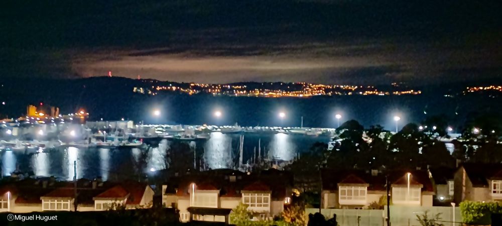 Al fondo se sitúan las luces de las poblaciones cercanas a Coruña. También se puede apreciar la contaminación lumínica que genera la ciudad de Ferrol y poblaciones como Neda, Narón o Fene.