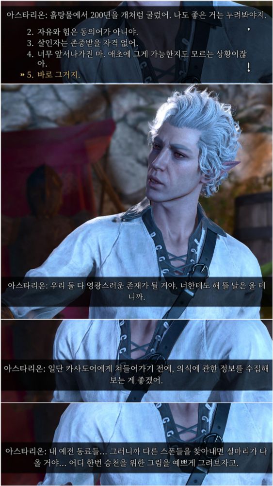1막때도 정보가 부족해서 정말 변이가 될지 안될지 모르는 상태였는데 플레이어한테 적대적인 말까지 해가며 올챙이를 탐냈었단 말이지... 아무래도 올챙이 자체보다는 1막 때의 아타가 현재의 아타보다 더 불안정하고 급박했기 때문이 아닐까 싶음... 1막에서는 언제 다시 카사도어에게 끌려갈지 모른다 생각했으니 말 그대로 그것만 아님 뭐든 괜찮단 마음 아니었을까...